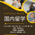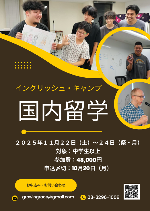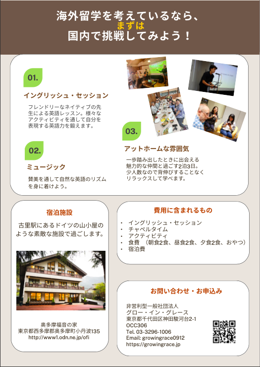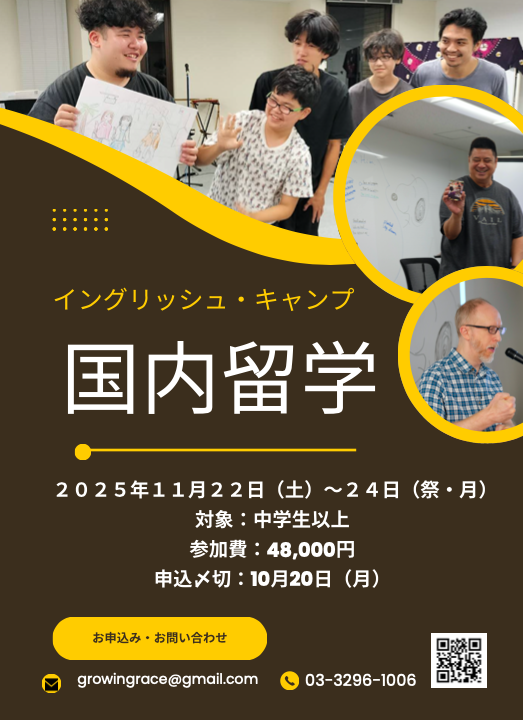 ブログ参加者募集中!イングリッシュ・キャンプin奥多摩 growingrace 2025年10月17日 自然のなか、ネイティブスピーカーや仲間達と英語で過ごす✨ 国内イングリッシュキャンプに参加しませんか? 次回のイングリッシュ・キャンプは11月22日(土)〜24日(月・祝)に奥多摩で行います!参加申し込みは10月20日まで可能です! 詳細はチラシの画像をご覧の上、ぜひぜひお申し込みください。ご不明な点はご遠慮なくお問い合わせくださいね♪